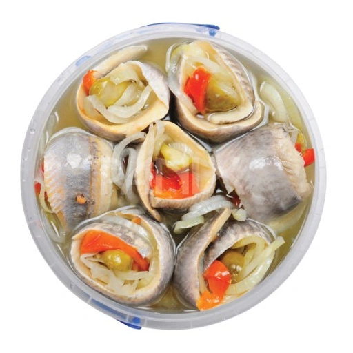 Marynowane w occie płaty śledziowe z ogórkiem, cebulą i papryką to tradycyjne rolmopsy o charakterystycznym, głębokim aromacie. Zapewnia go zaprawa octowo-korzenna, która dodaje rolmopsom wyrazistości i szczególnych walorów smakowych. Danie popularne i często goszczące na naszych stołach, idealnie sprawdza się w roli przystawki na przyjęciu czy kolacji.